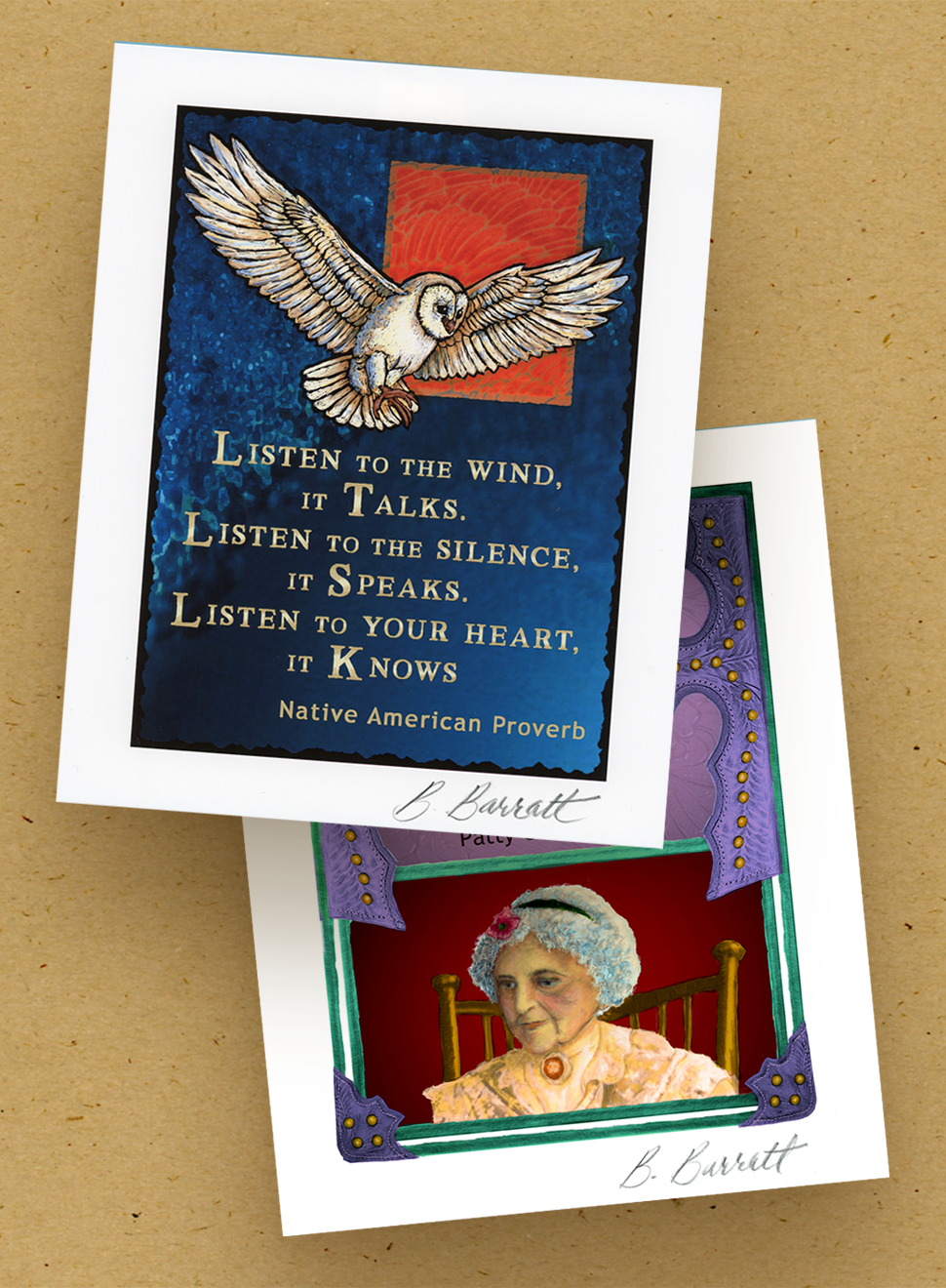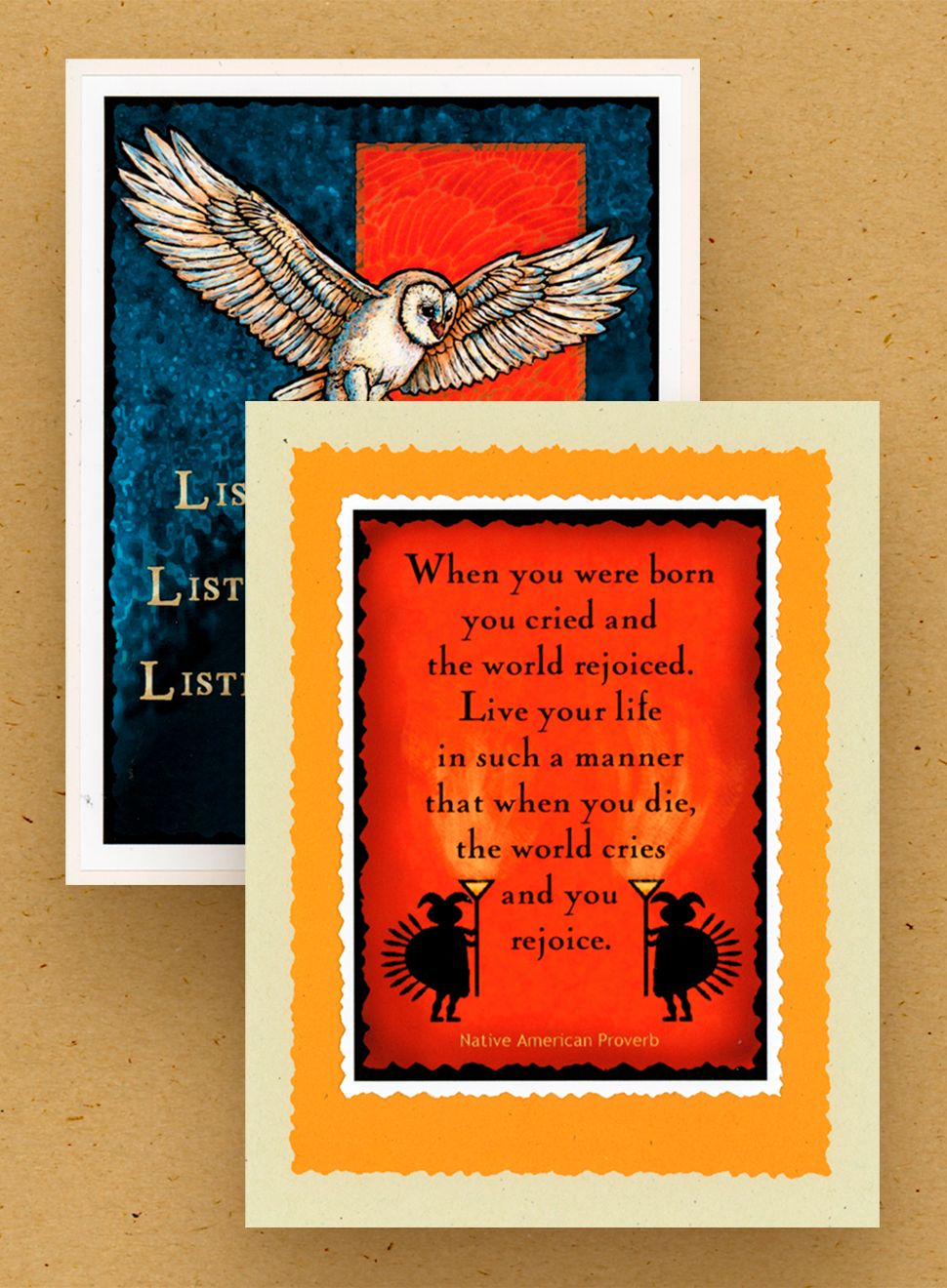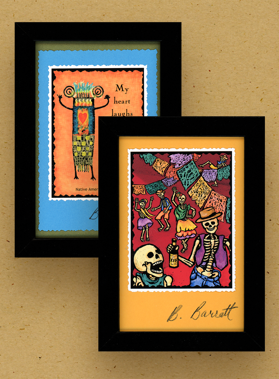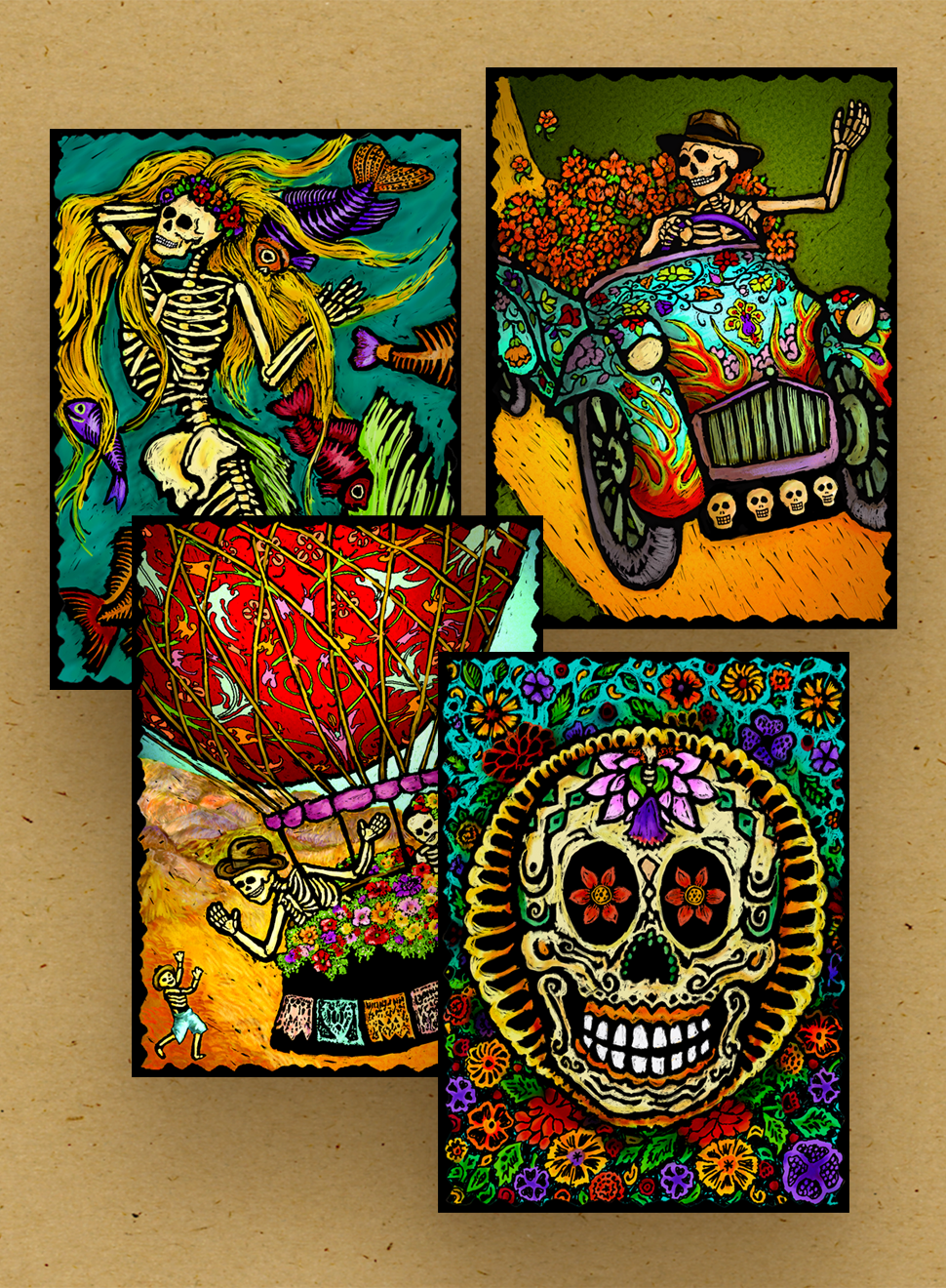 The cards are available in all of our designs. Crafted in layers with a colored background. The Day of the Dead, Nature and Cowgirls have larger art without the colored background.
